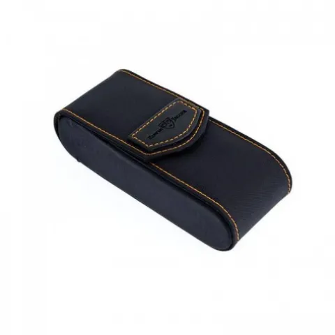 Eleganckie etui podróżne na maszynki do golenia Mach3 і Fusion z wydłużoną ręczką. Wykonane w czarnym kolorze z pomarańczowymi szwami. Logo producenta na przednim panelu. Wewnątrz trzy przegródki: jedna na maszynkę do golenia, dwie – na żyletki.