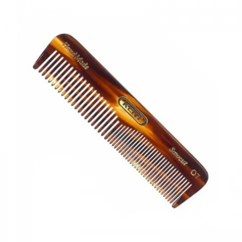 Męski grzebień kieszonkowy KENT 0T serii HANDMADE ogólnego zastosowania. Podzielony na dwie części: jedna z nich złożona jest z grubszych zębów o umiarkowanym rozstawie, a druga z cienkich zębów o małym rozstawie. To, której końcówki użyjesz, zależy od rodzaju włosów i ich gęstości.