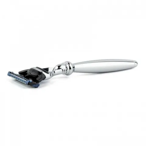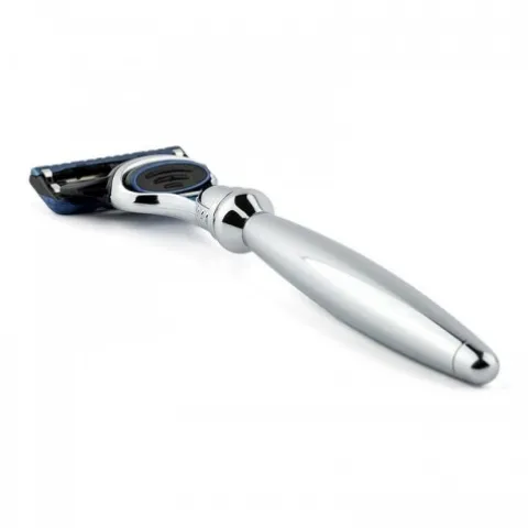 Elegancka maszynka do bezpiecznego golenia. Ostrza – Gillette Proglide-5. Maszynka z kolekcji Bulbous. Chromowana polerowana obudowa z mosiądzu.