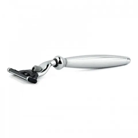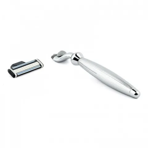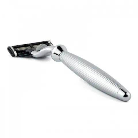Elegancka maszynka do golenia z kolecji Bulbous Lined. Ostrza – Gillette Mach3. Chromowana, wykonana z mosiądzu. Rączka z grawerem.