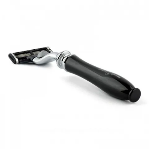 Bezpieczna maszynka do golenia z kolekcji Chatsworth. Ostrza – Gillette Mach3. Rączka wykonana ze szlachetnej żywicy syntetycznej w klasycznym czarnym kolorze.