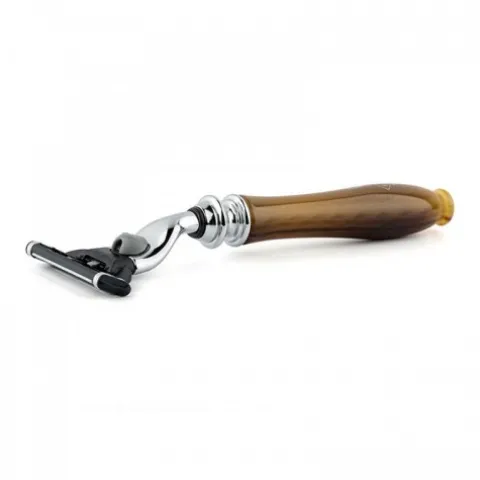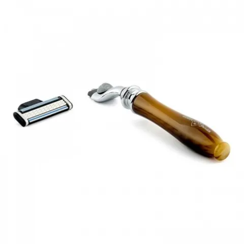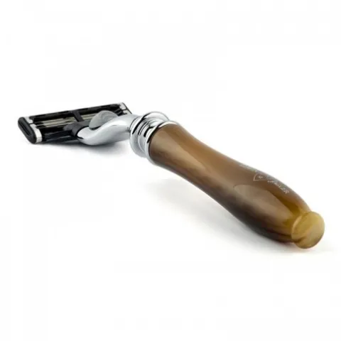 Bezpieczna maszynka do golenia z kolekcji Chatsworth. Ostrza – Gillette Mach3. Rączka jest wykonana z żywicy syntetycznek, która jest imitacją rogu bawoła.