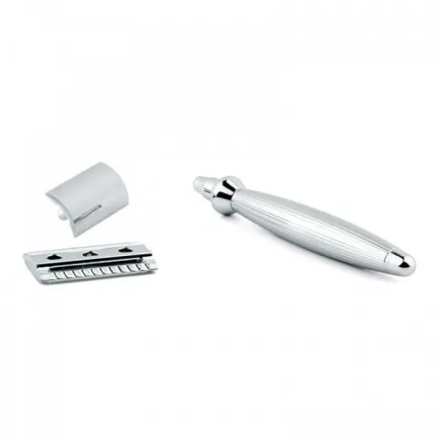 Maszynka trzyczęściowa.Trzy części maszynki to: (1) uchwyt z gwintem, (2) dolna część głowicy tzw. grzebień i (3) górna część głowicy tzw. dekielek . Aby wymienić ostrze, wystarczy podnieść głowicę i włożyć żyletkę. Wygodna, rączka z antypoślizgowymi radełkowanymi żłobieniami. Idealny wybór dla poczatkujących brodaczy!