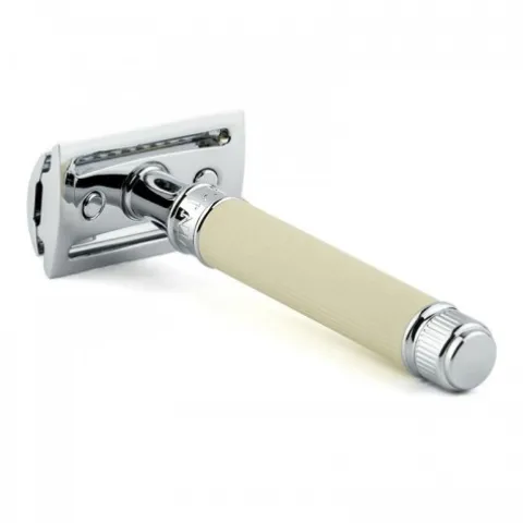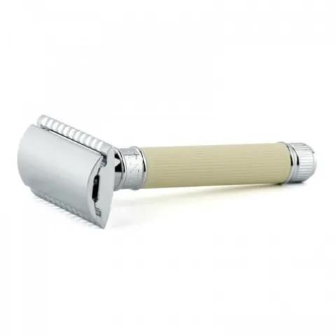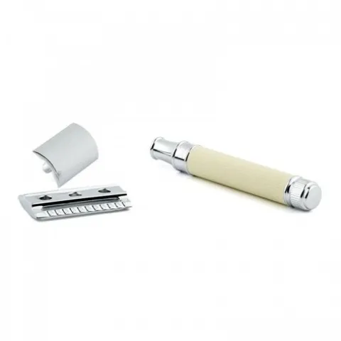 Elegancka maszynka do golenia w kolorze kości słoniowej. Rączka pokryta gumą, dlatego jest antypoślizgowa. Precyzyjnie wykonany grzebień oraz solidna rączka sprawią, że codzienne golenie jest przyjemnością. Maszynka ma zamknięty grzebień.