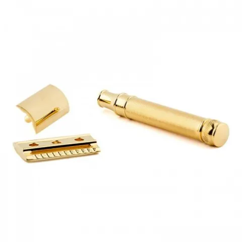 Elegancka maszynka do golenia na żyletki w złotym kolorze. Maszynka do golenia pokryta płytkami z 23-karatowego złota.