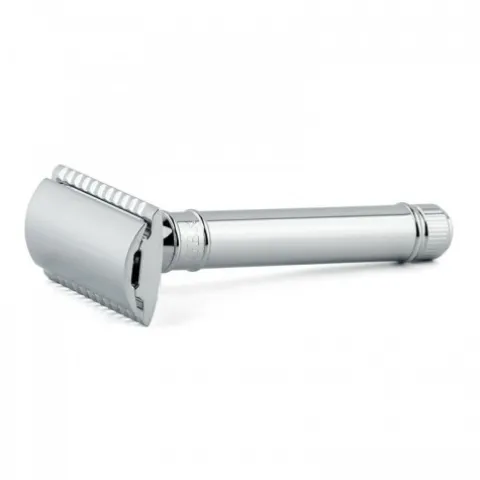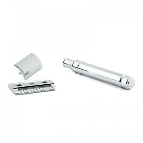 Tradycyjna maszynka do golenia, chromowana. Składa się z trzech części bezpieczny zamknięty grzebień. Przeznaczona do codziennego golenia. Bardzo dobrze wyważona. Długość głowicy maszynki- 25 mm; szerokość głowicy – 41 mm.