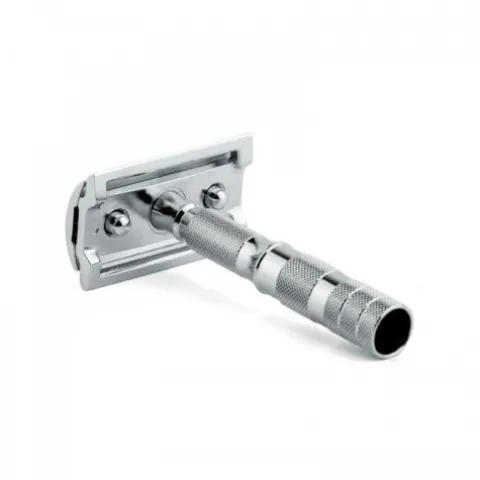 Maszynka do golenia w kształcie litery Merkur Solingen Travel Razor polerowana, chromowana. Maszynka trzyczęściowa. .