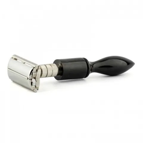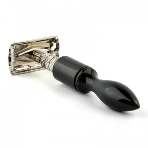 Maszynka do golenia z rączką z rogu bawolego. Głowica maszynki wykonana z mosiądzu z niklowym pokryciem, odporna na korozję.