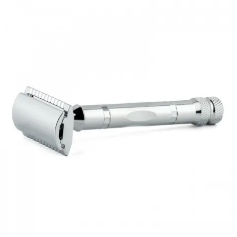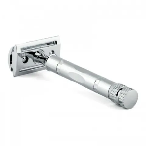 Klasyczna maszynka do golenia w kształcie litery T. Wspaniała maszynka, która składa się z trzech części, dobrze wyważona. Harmonicznie łączy w sobie zalety klasycznej maszynki i wspaniały współczesny design.