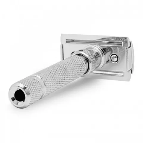 Wykonana z mosiądzu i znalu, pokryta błyszczącym chromowanym wykończeniem, maszynka do golenia Blazer ma 6 poziomów regulacji (1 Delikatniejsze cięcie | 6 Bardziej efektywne cięcie).