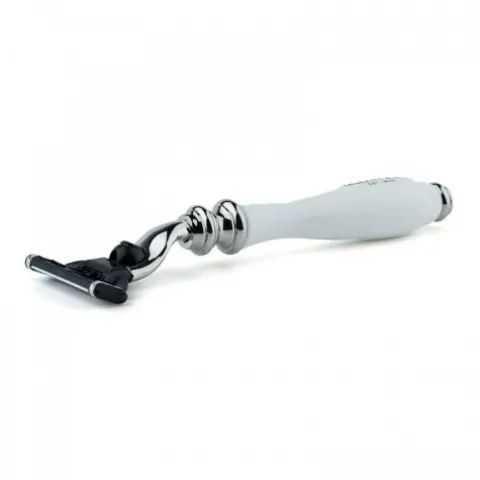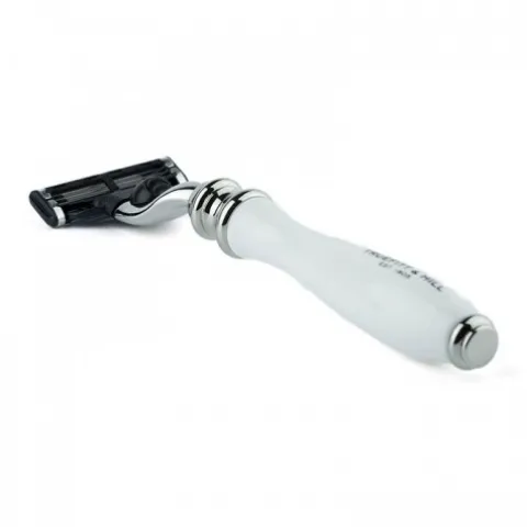 Maszynka do golenia Truefitt & Hill Wellington Faux Porcelain Fusion Mach 3 w białym kolorze. Z systemem ostrzy Mach 3. Wykonana w klasycznym stylu, wygodna rączka.
