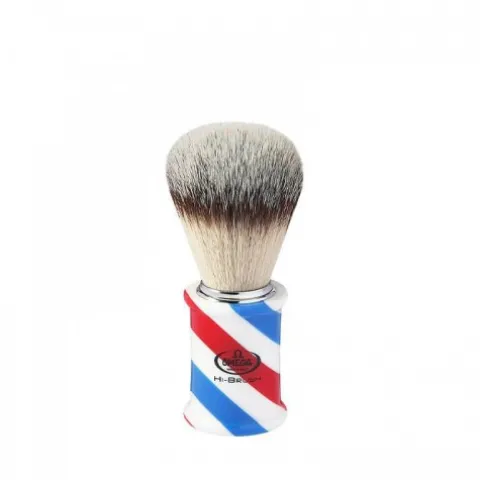 Jaskrawy pędzel do golenia z uchwytem w kształcie znaku fryzjerskiego. Pędzel z włosia badger style.