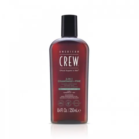 AMERICAN CREW CLASSIC 3in1 CHAMOMILE&PINE SZAMPON ODŻYWKA ŻEL. Uniwersalny szampon, odżywka i płyn do mycia ciała o kojącym aromacie rumianku i sosny. Formuła doskonale oczyszcza i nawilża zarówno włosy, jak i ciało, zapewniając jednocześnie obfite, luksusowe pienienie, które skutecznie usuwa zanieczyszczenia, pot oraz resztki produktów do stylizacji. Dodatkowo wspomaga i uzupełnia naturalną barierę wilgoci skóry, zapewniając kompleksową pielęgnację. Zainspirowany aromachologią, delikatny zapach rumianku i sosny eChamomile + Pine ma na celu wywołanie uczucia spokoju i relaksu. To nie tylko chwila pielęgnacji, ale również prawdziwa przyjemność dla zmysłów.