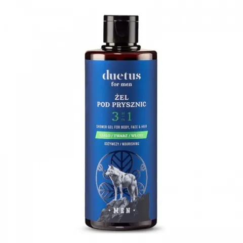 Odżywczy żel pod prysznic 3w1 dla mężczyzn Duetus. Odżywczy żel pod prysznic inspirowany siłą i odwagą wilka to wyjątkowy produkt, który łączy męską determinację z elegancją, oferując kompleksowe oczyszczanie twarzy, ciała i włosów. Jego innowacyjna formuła, wzbogacona o nawilżające składniki, skutecznie oczyszcza skórę i włosy, pozostawiając je gładkie, nawilżone i pełne witalności. Dzięki zmysłowemu zapachowi pełnemu pewności siebie, żel otula Cię i buduje poczucie siły, gotowości do stawienia czoła wyzwaniom dnia.