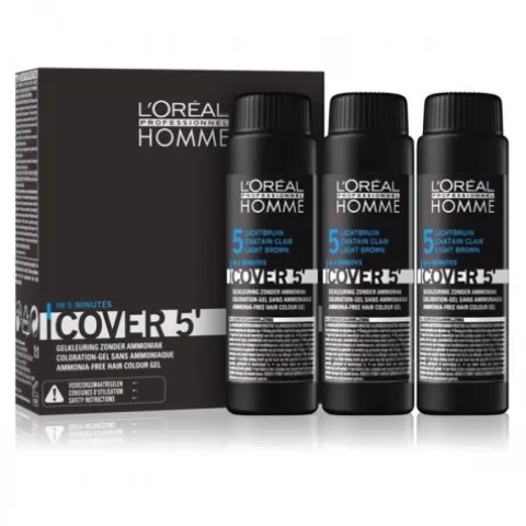 Opis: Zestaw koloryzujący do siwych włosów poziom 5 L’Oréal Professionnel Homme Cover 5′ Light Brown 3 x 50 ml