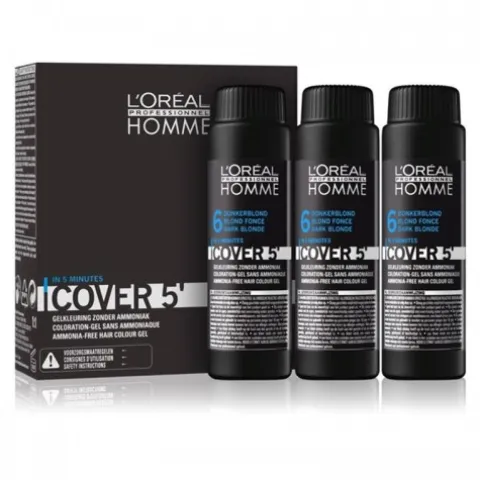 Opis: Zestaw koloryzujący do siwych włosów poziom 6 L’Oréal Professionnel Homme Cover 5′ Dark Blonde 3 x 50 ml