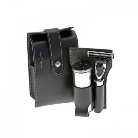 Funkcjonalny zestaw do golenia w trwałym skórzanym etui doskonale sprawdza się w podróżach. W komplecie maszynka do golenia Gillette Mach3. Jaskrawa krótka niklowana rączka. Pędzel do golenia z włosia borsuka klasy best badger.