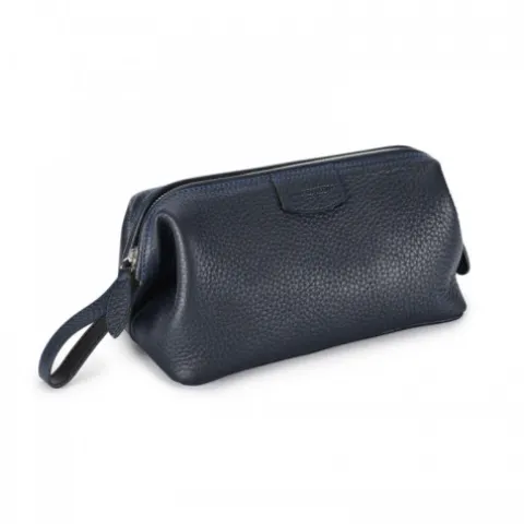 Przed nami granatowa kosmetyczka Gentelman’s Wash Bag Blue od Truefitt & Hill. Jest pojemna i komfortowa, przeznaczona dla prawdziwych gentlemanów, którzy dbają o swój wygląd. Kosmetyczka wykonana jest ze skóry naturalnej i ozdobiona stylowym tłoczeniem logo producenta.