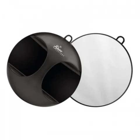 Lustro fryzjerskie barberskie The Shave Factory Mirror With Hadle — okrągłe czarne lusterko w idealnym rozmiarze do każdego salonu fryzjerskiego lub kosmetycznego. Służy do sprawdzenia nowej fryzury lub wyglądu klientki z każdej strony.
