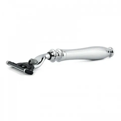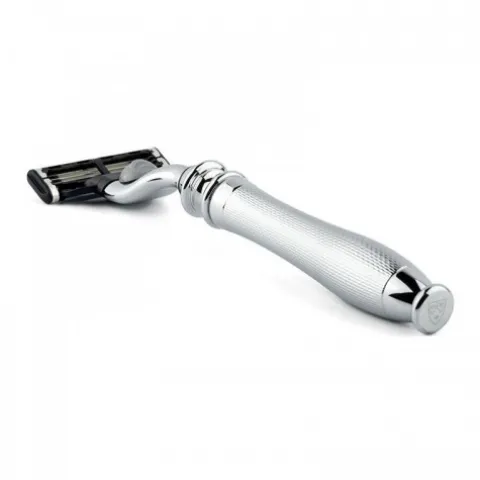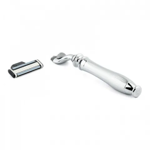 Bezpieczna maszynka do golenia z kolekcji Chatsworth Metal Barley. Ostrze – Gillette Mach 3. Chromowana, obudowa z mosiądzu.
