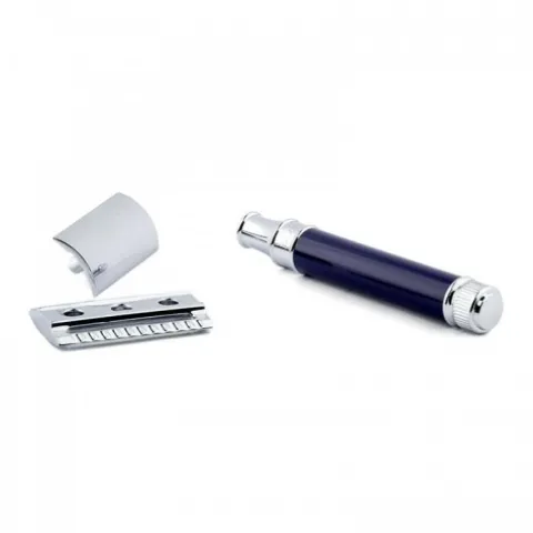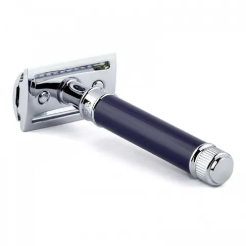 Elegancka maszynka do golenia w kształcie litery T z granatową rączką. Zamknięty grzebień. Dobrze wyważona. Ozdobiona elementami chromowanymi. 5 ostrzy Feather w KOMPLECIE!