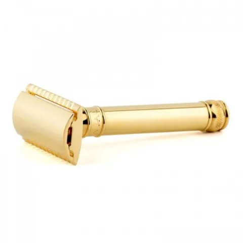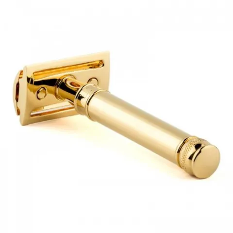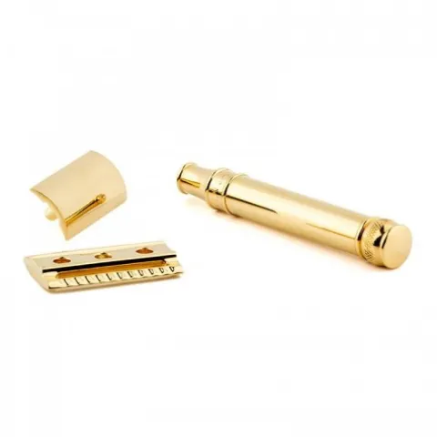 Klasyczna maszynka do golenia w kształcie litery T, trzyczęściowa, z zamkniętym grzebieniem. Ergonomiczny, doskonale dopasowany kształt uchwytu maszynki do golenia został zaprojektowany tak, aby perfekcyjnie zbalansować kontakt między dłonią a skórą twarzy. Pokryta płytkami 24 karatowego złota.