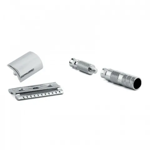 Maszynka do golenia w kształcie litery Merkur Solingen Travel Razor polerowana, chromowana. Maszynka trzyczęściowa. .