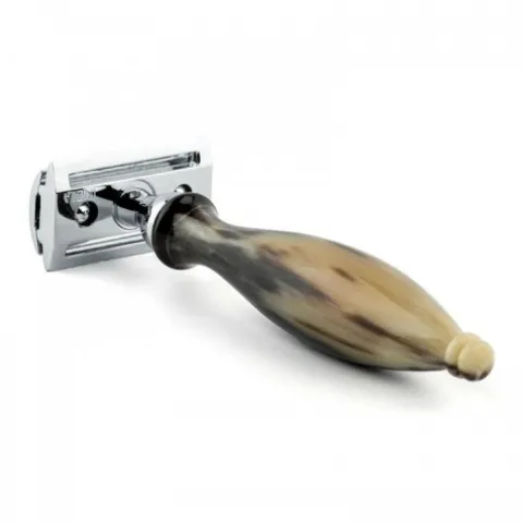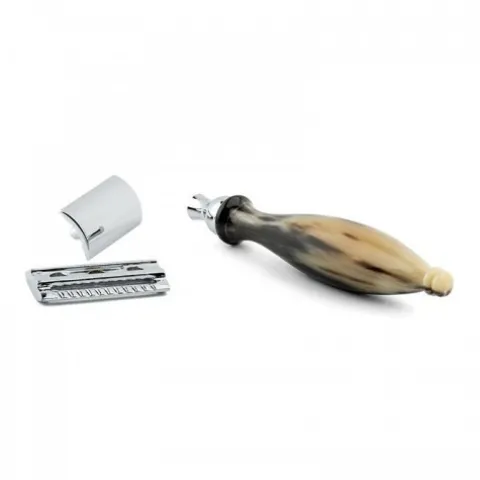 Maszynka do golenia, która łączy w sobie elegancki design i wysoką jakość. Rączka z naturalnego rogu bawolego. Głowica maszynki praktycznie taka sama jak Merkur HD albo Merkur 38C.