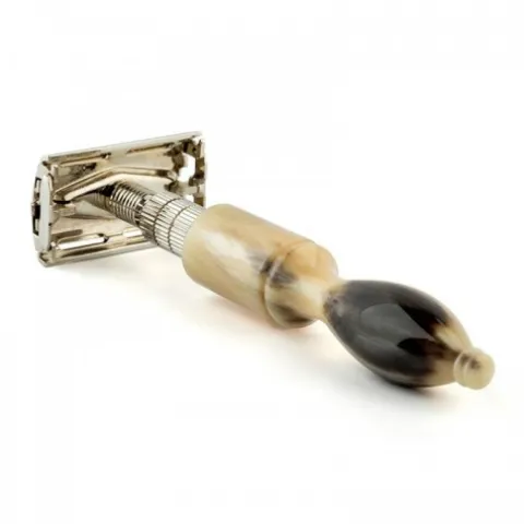 Bezpieczna maszynka do golenia z naturalnego krowiego rogu. Głowica maszynki wykonana z mosiądzu z niklowym pokryciem.