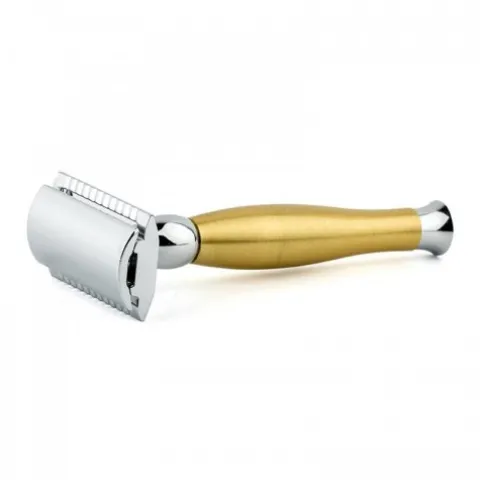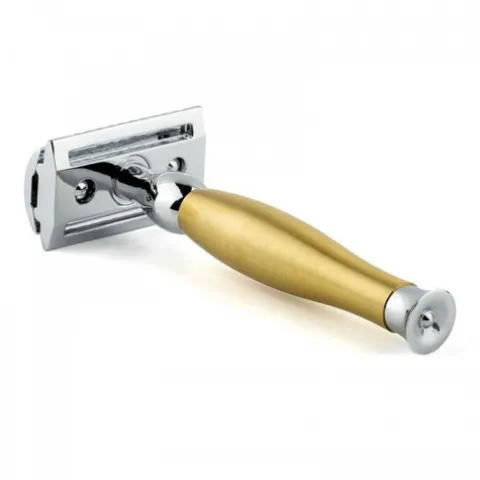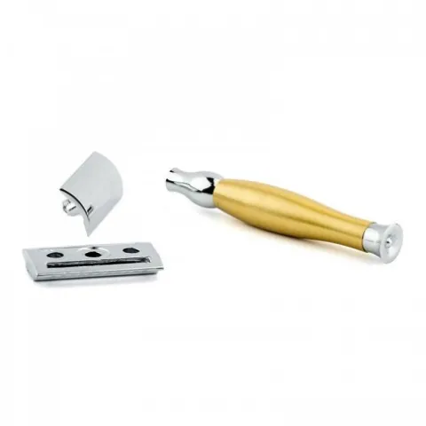 Klasyczna maszynka w kształcie litery T z zamkniętym grzebieniem, trzyczęściowa. Należy do kategorii ciężkich maszynek do golenia. Dobrze wyważona maszynka z chromowaną głowicą. Wydłużona rączka z mosiądzu wykończona na matowo w złotym kolorze.
