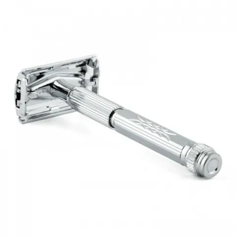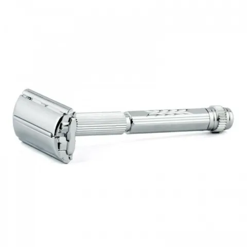 Maszynka do golenia „motylkowa. By wymienić w nich żyletkę, nie trzeba ich rozkładać na części. Wystarczy pokręcić końcówką uchwytu, by otworzyły się skrzydełka głowicy. Głowica w całości wykonana z polerowanego chromu.