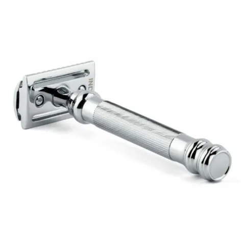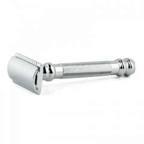 Dosyć ciężka maszynka do golenia. Rączka z wygodnymi żłobieniami antypoślizgowymi, które dodatkowo akcentują piękno i kształt uchwytu oraz znacząco poprawiają przyczepność podczas golenia.Maszynka ma niklowe pokrycie.