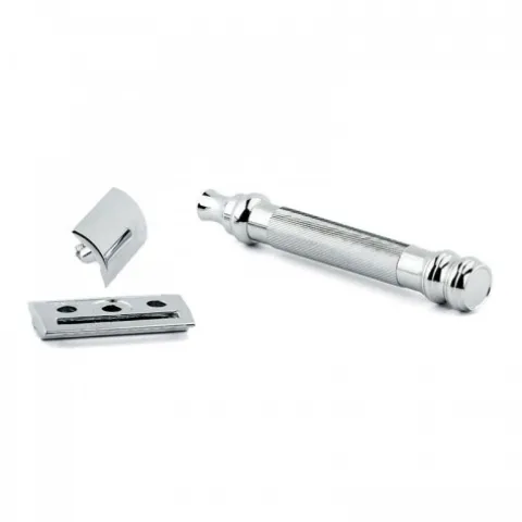 Maszynka do golenia w kształcie litery T PARKER 98 R składa się z trzech części. Aby wymieć żyletki trzeba zdjąć dekielek..