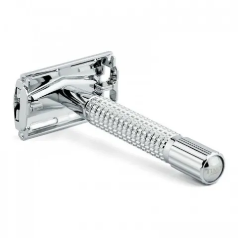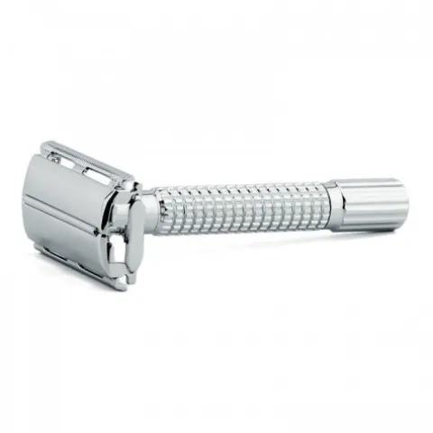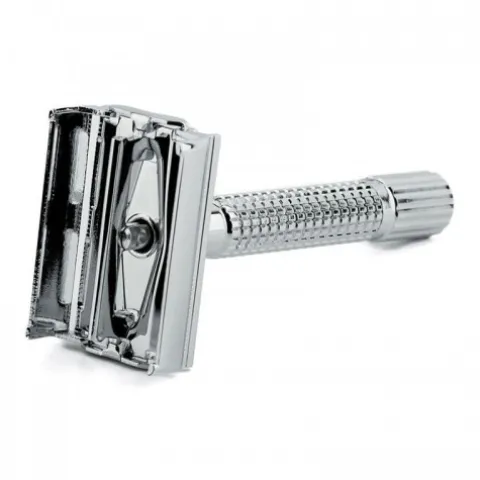 Maszynka do golenia „motylkowa”. Łatwy i szybki sposób wymiany żyletek. Bardzo łagodna. Zamknięty grzebień. Maszynka wykonana ze stali nierdzewnej, chromowana.