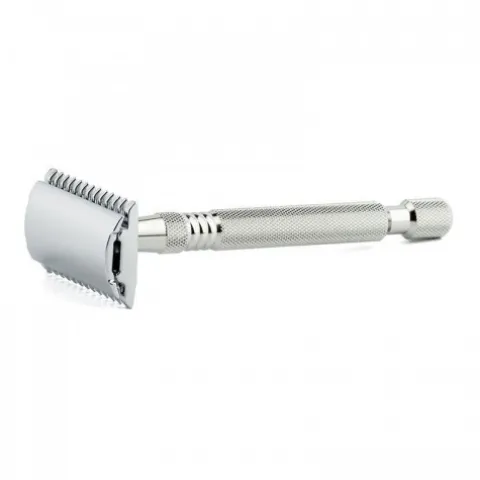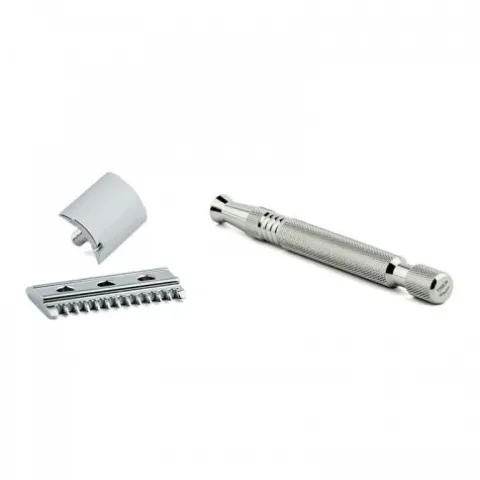 Niemiecka maszynka do golenia Timor wykonana z wysokogatunkowej stali nierdzewnej z wydłużoną rączką z radełkowanymi żłobieniami. .