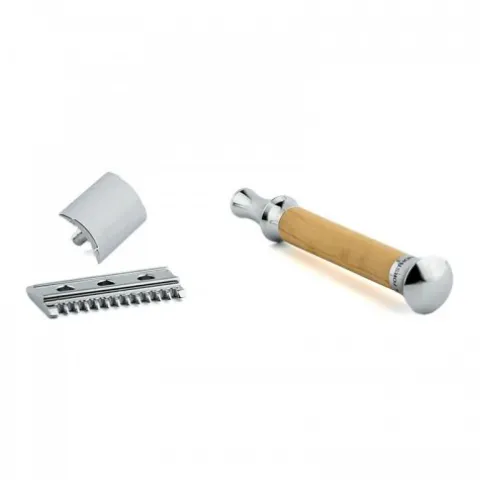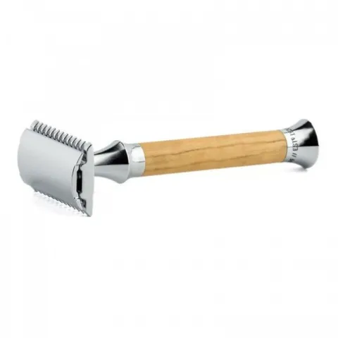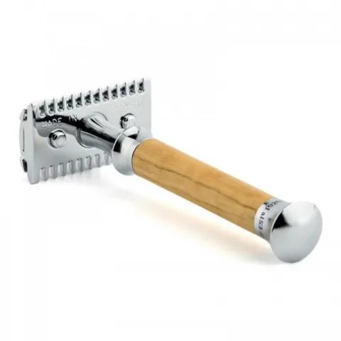 Maszynka do golenia z otwartym grzebieniem. Dobrze wyważona maszynka o klasycznym designu. Rączka wykonana z drzewa oliwnego, a głowica z litego cynku, chromowana, w całości wykonana ze stali nierdzewnej.
