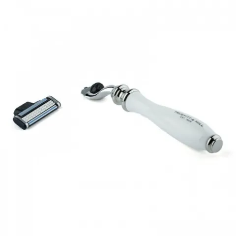 Maszynka do golenia Truefitt & Hill Wellington Faux Porcelain Fusion Mach 3 w białym kolorze. Z systemem ostrzy Mach 3. Wykonana w klasycznym stylu, wygodna rączka.