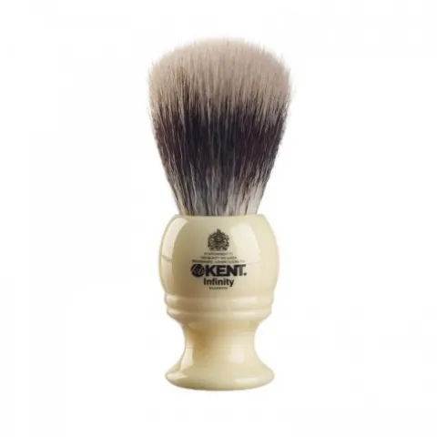 Pędzel do golenia Kent INF1 ma żywiczny uchwyt, który perfekcyjnie imituje kość słoniową, a kolor jasnego, czystego włosia złamanego ciemnym pasmem, nadaje efekt imitujący szczecinę borsuka.