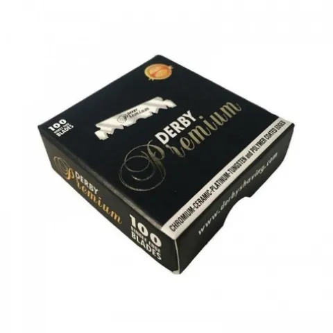 DERBY PREMIUM 100 sztuk to wysokiej jakości żyletki segmentu premium w przystępnej cenie.Wykonane z najwyższej jakości szwedzkiej stali nierdzewnej.W procesie technologicznym pokrywane powłokami ceramicznymi i polimerowymi, platynowane, chromowane i wolframowane.Każda żyletka opakowana w parafinowaną bibułkę.100 sztuk to 20 pudełeczek po 5 sztuk żyletek w każdym – wszystko razem zapakowane w podłużny kartonik zbiorczy.