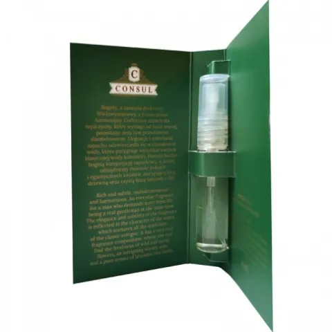 Woda kolońska Consul charakteryzuje się niezwykle bogatym i dyskretnym zapachem świeżych polnych i egzotycznych kwiatów, nut drzewnych, ziół i lawendy. Stworzona dla mężczyzn poszukujących połączenia klasyki, wyrafinowania i oryginalności. Idealny codzienny zapach dla prawdziwego gentlemana.