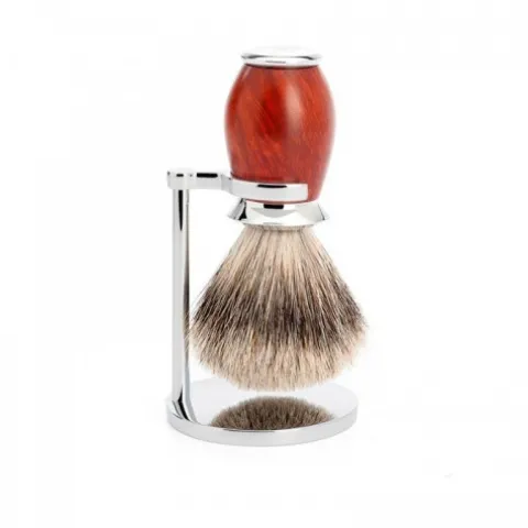 Muhle RHM50RP Stojak niemieckiej firmy Muhle to solidny i pięknie wykonany gadżet niezbędny w męskiej łazience, gdzie kultywuje się tradycję golenia na mokro..Wyróżnia go prosty, elegancki design oraz zastosowanie w procesie produkcji wysokiej jakości materiałów, mosiądzu oraz chromu. Powierzchnia stojaka została spolerowana na tak zwane „lustro”, co nadaje mu znamion luksusu.Stojak jest bardzo praktycznym rozwiązaniem, ponieważ dzięki niemu w łatwy sposób uporządkujesz przestrzeń na Twojej toaletce przeznaczoną na akcesoria do golenia. Przy okazji zadbasz również o utrzymanie i higienę pędzla, który będzie miał możliwość prawidłowo wyschnąć po goleniu w pozycji włosiem do dołu. Dzięki temu woda nie będzie zalegać u podstawy knota, co może powodować osłabienie mocowania włosia oraz jego stęchnięcie.