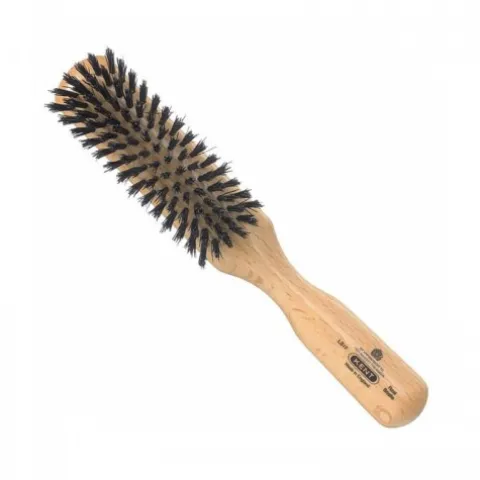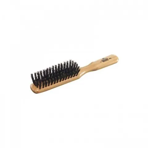 Wąska nieco płaska szczotka do włosów z czarnym naturalnym włosiem. Wykonana z drewna satynowego i drewna bukowego. Szczotka do włosów KENT LS17 szczególnie się sprawdza w przypadku długich włosów.