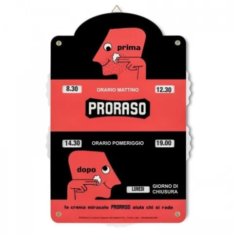 Tabliczka na drzwi Proraso jest nie tylko wspaniałą ozdobą, ale również pozwala klientom dowiedzieć się o godzinach pracy salonu.