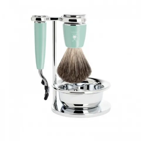 Zestaw do golenia Mühle S81M224Sm3 Rytmo będzie Twoim niezastąpionym pomocnikiem podczas golenia. Składa się z pędzla do golenia do wytwarzania piany, a również maszynki do golenia na wymienne wkłady Gillette Mach 3, który zapewnia idealne golenie bez podrażnień. Stojak jest bardzo praktycznym rozwiązaniem, ponieważ dzięki niemu w łatwy sposób uporządkujesz przestrzeń na Twojej toaletce przeznaczoną na akcesoria do golenia. Przy okazji zadbasz również o utrzymanie i higienę pędzla, który będzie miał możliwość prawidłowo wyschnąć po goleniu w pozycji włosiem do dołu. Uchwyty pędzla i maszynki wykonane w jednakowym stylu z wysokojakościowej żywicy syntetycznej w miętowym kolorze, wykańczane polerowanym chromem. Zestaw od Mühle – wspaniały pomysł na prezent. Zamawiaj w naszym sklepie internetowym.
