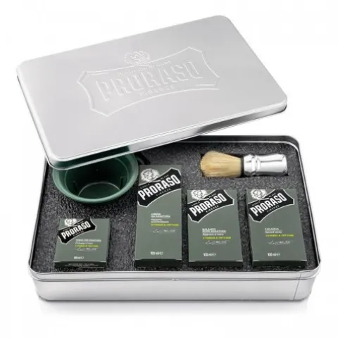 Proraso Cypress & Vetiver — to znakomity zestaw prezentowy w metalowym pudełku kultowej włoskiej marki, w środku którego znajduje się wszystko, czego mężczyzna może potrzebować zarówno podczas przygotowania, jak i w trakcie golenia.