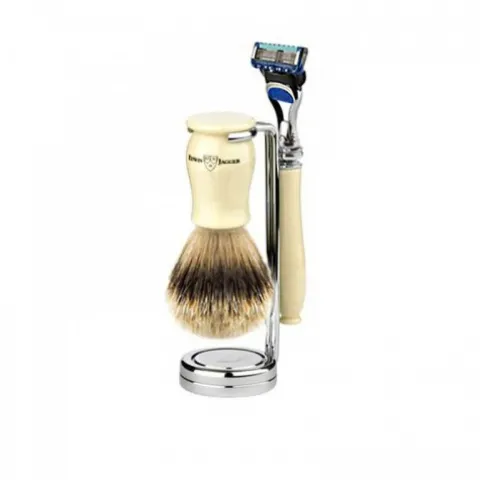 Maszynka do golenia z systemem ostrzy Gillette Fusion Pro-Glide, która zapewnia naprawdę jakościowe i komfortowe golenie. Pędzel z włosia borsuka klasy Super Badger. Włosie główki jest ciemne. Do suszenia pędzla jest stojak. Stojak i elementy uchwytu maszynki wykonano z niklu, a uchwyt maszynki i pędzla wykonana z żywicy syntetycznej, co jest imitacją kości słoniowej.