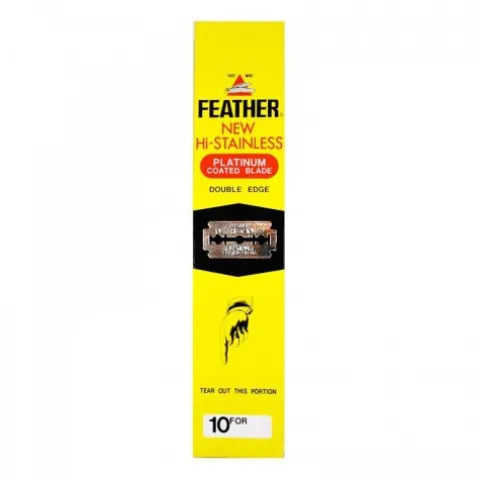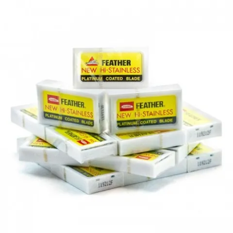 Feather New Hi- Stainless – żyletki do maszynek w kształcie litery T. Zapakowane w 20 pudełeczek Każde pudełeczko zawiera 10 sztuk żyletek.